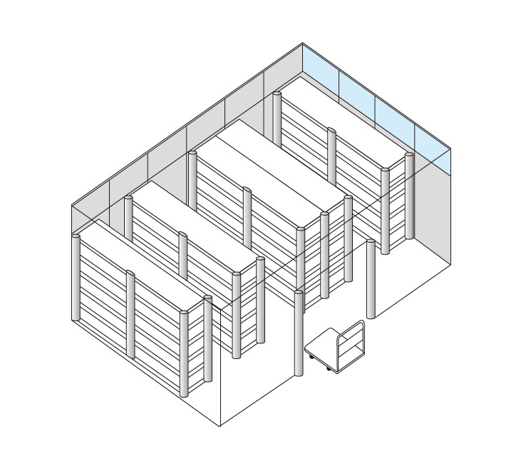スペースの有効利用の為に架台上に部屋を作ったり、特殊な作業工程を分ける為にラインの一部に組み込んだり、様々な条件に合わせたバリエーションで設置可能です。